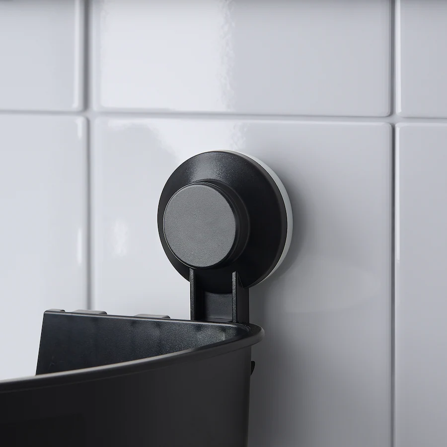 شلف دیواری حمام چسبی ایکیا TISKEN مشکی یک راهحل کاربردی و مدرن برای نظمدهی به لوازم حمام است. این شلف با سیستم مکنده (وکیومی) و بدون نیاز به سوراخکاری یا دریل، بهراحتی روی سطوح صاف مانند کاشی، شیشه و سرامیک نصب میشود.