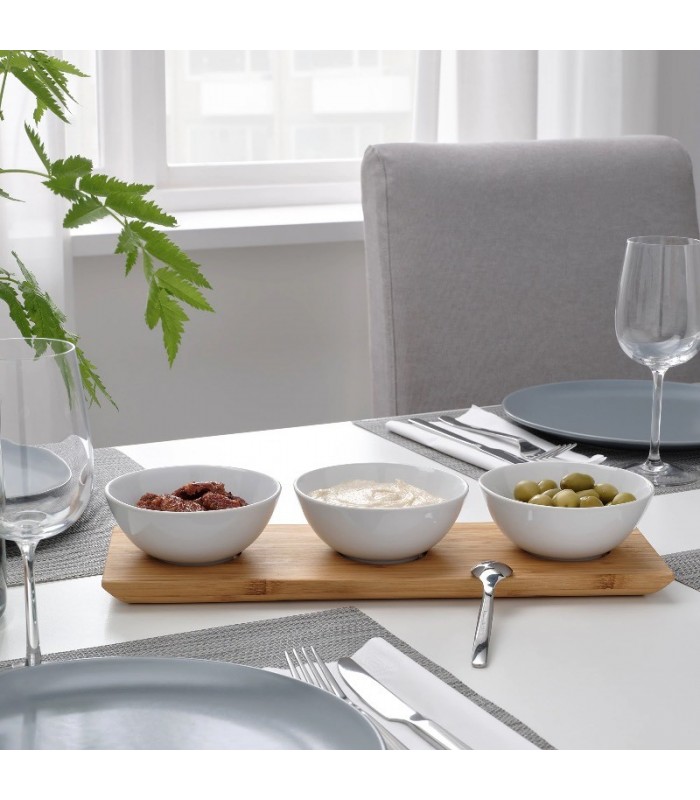 ست سینی TYNGDLÖS با ۳ عدد کاسه سفید از جنس سرامیک و پایهی بامبویی، ترکیبی از سادگی، کاربرد و زیبایی در دکور میز پذیرایی یا آشپزخانهی شماست. مناسب برای سرو انواع تنقلات، مزه، سس، خشکبار یا میوههای خردشده. طراحی مینیمال و طبیعی این محصول آن را به انتخابی ایدهآل برای مهمانیها و حتی استفادهی روزمره تبدیل کرده است.