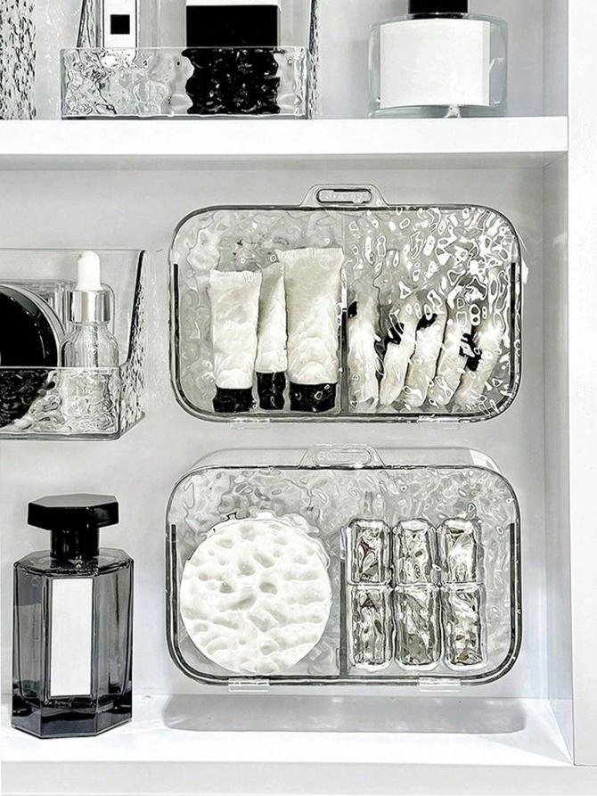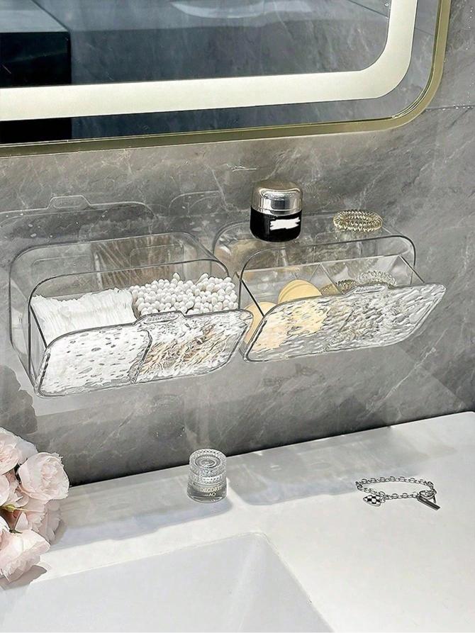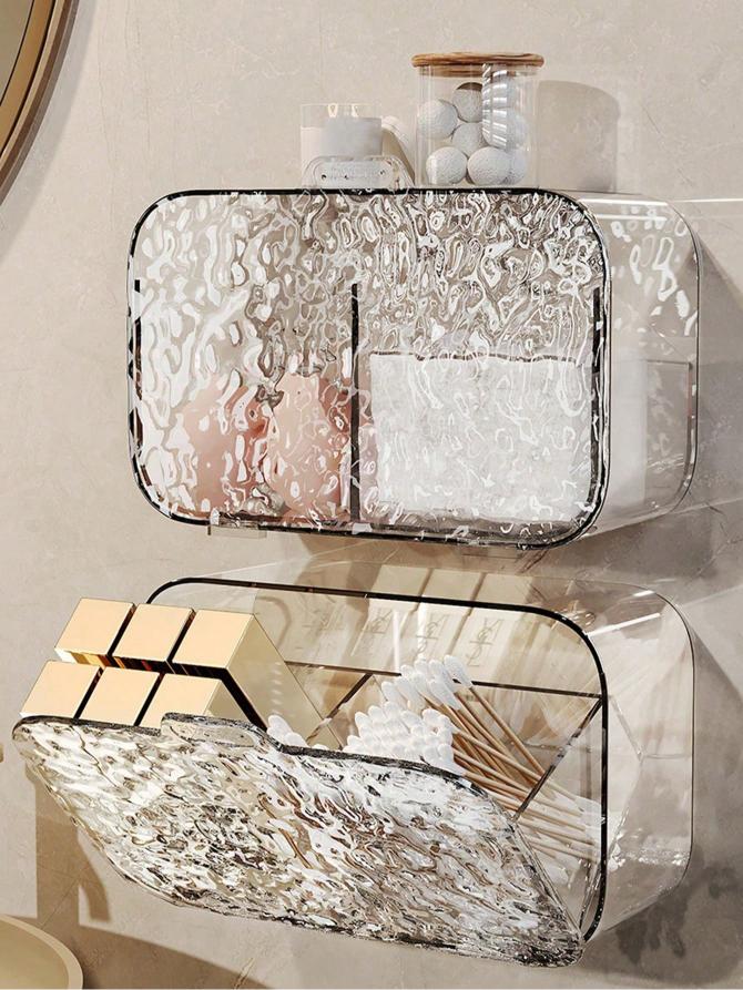 باکس دیواری چسبی سرویس بهداشتی شفاف با طراحی مدرن و جنس مقاوم PET، انتخابی ایدهآل برای نظمدهی لوازم آرایشی، پدهای آرایش، گوشپاککن، یا لوازم بهداشتی در سرویس بهداشتی و اتاق خواب است.