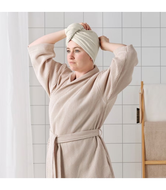 حوله مخصوص پیچیدن مو مدل STJÄRNBUSKE از برند IKEA با رنگ طبیعی، یک انتخاب کاربردی و سبک برای خشک‌کردن مو پس از حمام است. این حوله طراحی خاصی دارد که به راحتی دور مو پیچیده می‌شود و با دکمه‌ی کوچک خود در جای خود ثابت می‌ماند. مناسب برای موهای کوتاه و بلند و گزینه‌ای عالی برای روتین مراقبت از مو.