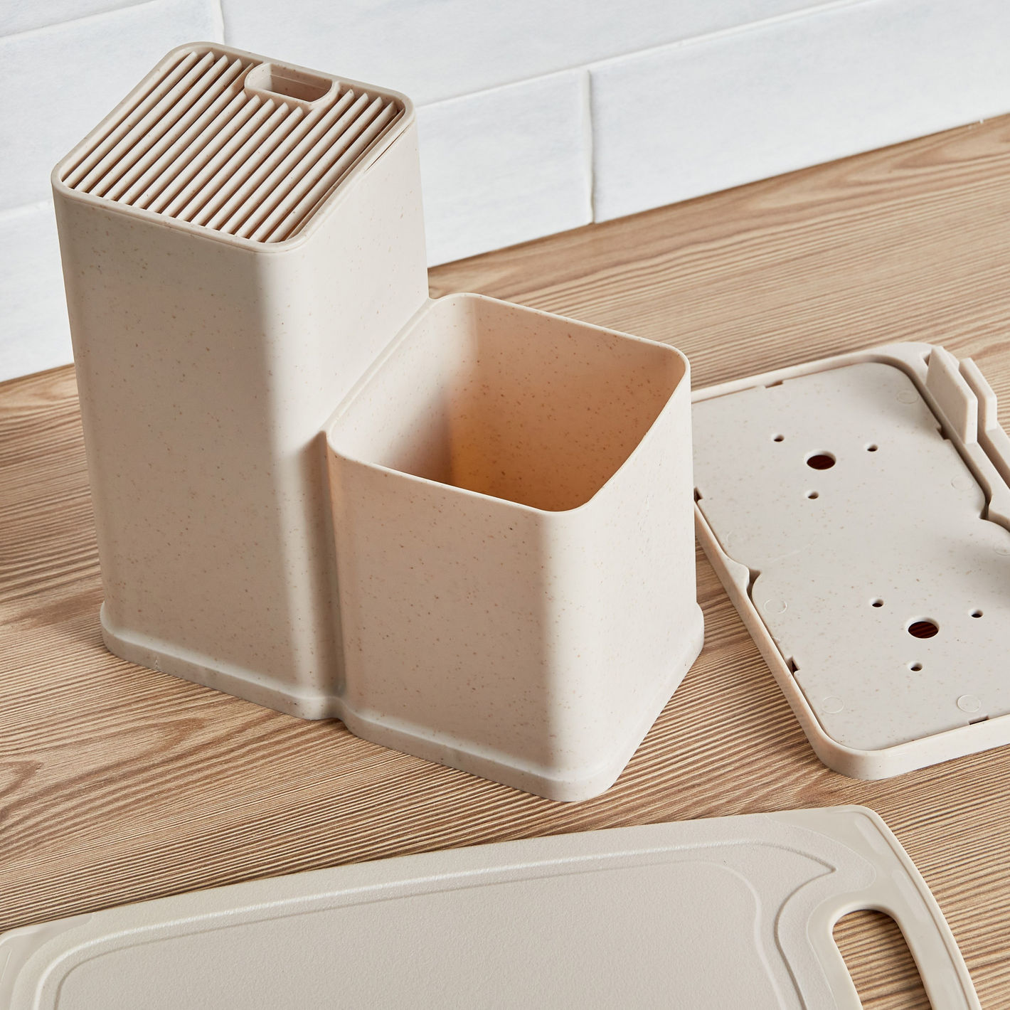 ست لوازم آشپزخانه هوم سنتر شامل ۱۸ قطعه ضروری آشپزخانه است که هر خانهای به آن نیاز دارد. این مجموعه شامل تخته خردکن، چاقوهای آشپزی، قاشق، کفگیر، ویسک، قیچی و جایگاه مخصوص نگهداری میباشد.