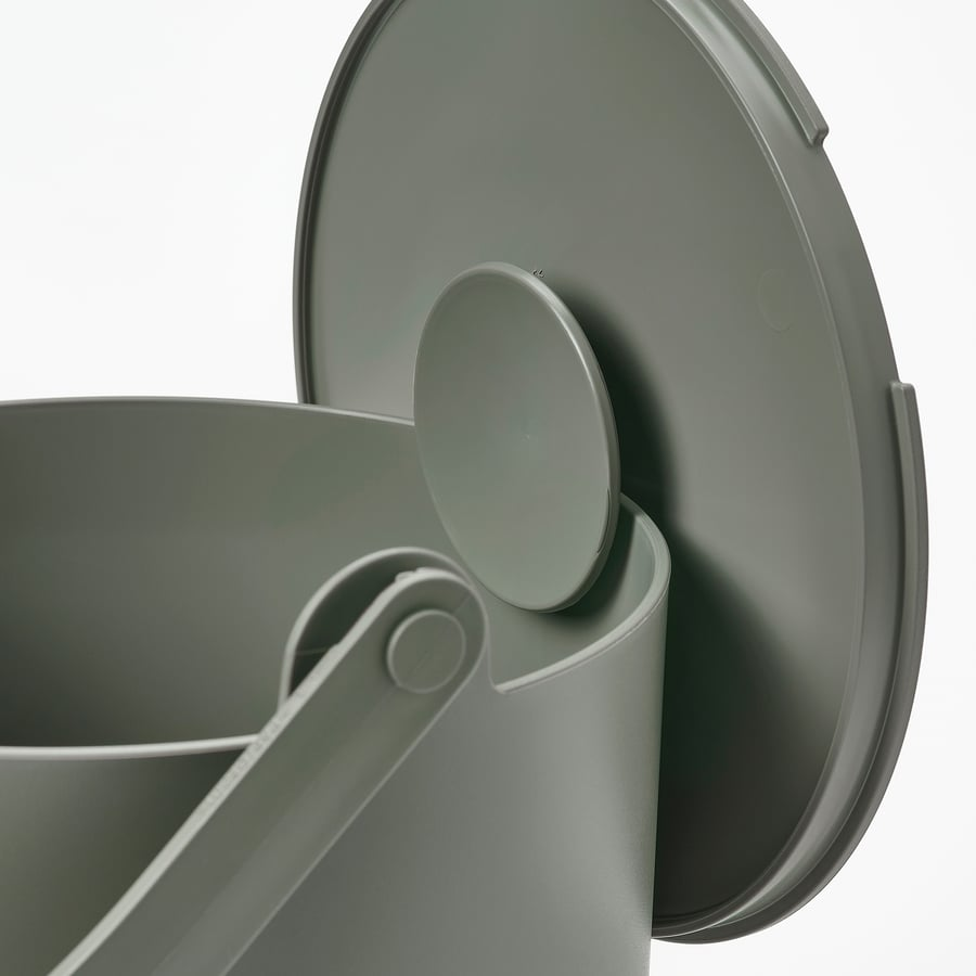 سطل زباله درب دار رنگ خاکستری-سبز مات و مینیمال آن به راحتی با دیگر تجهیزات آشپزخانه هماهنگ میشود. درب با طراحی هوشمندانه، مانع خروج بو و جذب حشرات میشود و دستهی محکم، جابجایی آن را راحت کرده است.