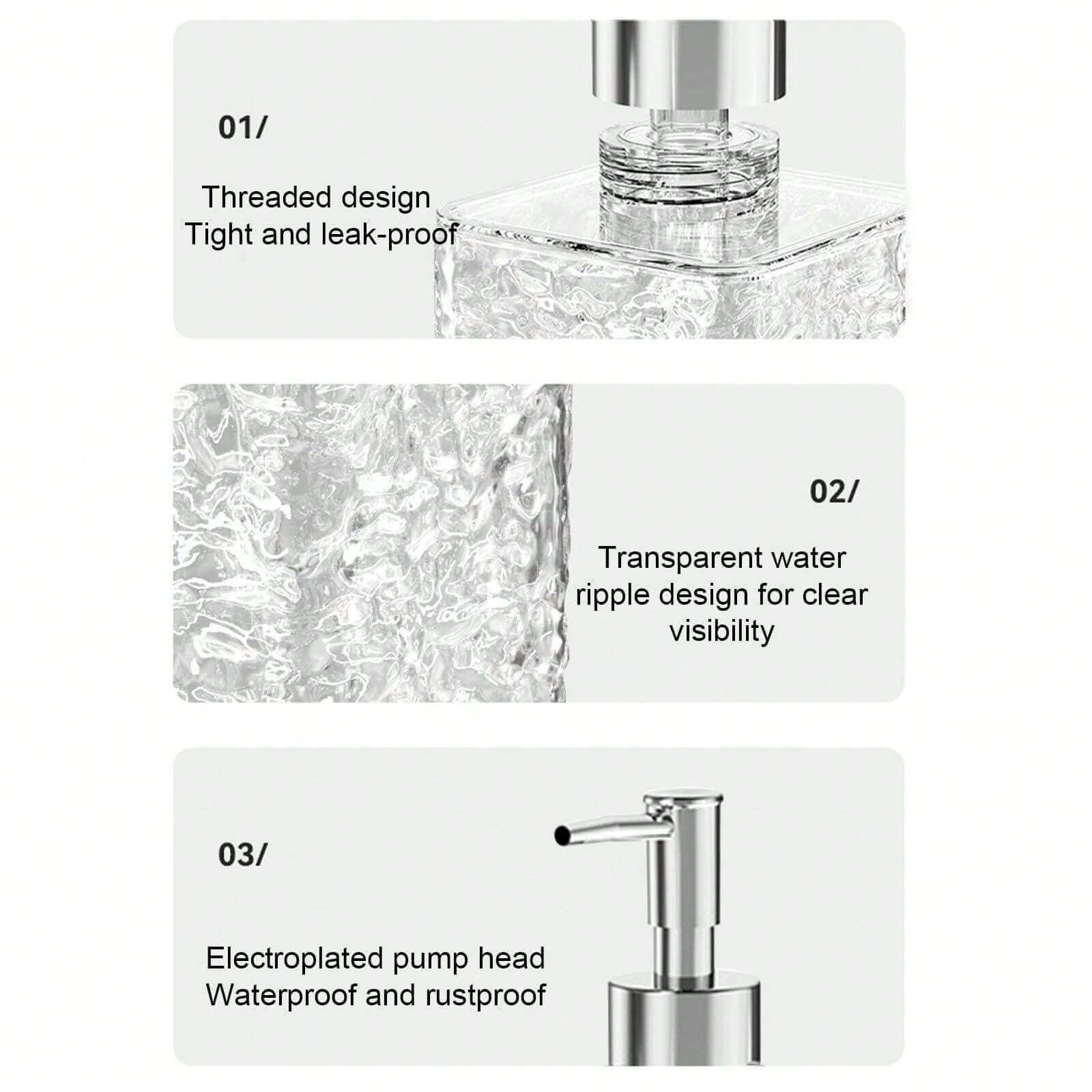 پمپ مایع دستشویی کریستالی ساختهشده از متریال مقاوم PET، مناسب برای انواع مایع دستشویی، شامپو، مایع ظرفشویی و ضدعفونیکننده دست است.